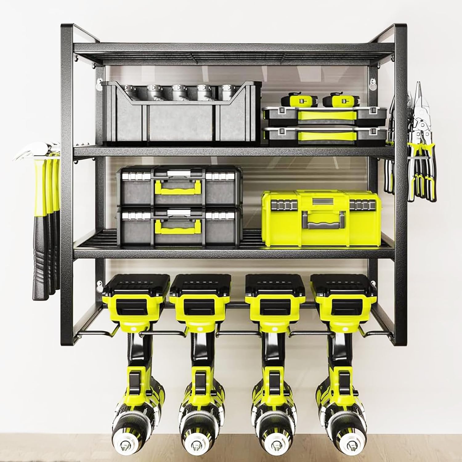 - [Heavy Duty & Durable] - Made of heavy-duty steel with a strong powder coating, this power tool organizer is robust, rust-resistant, and non-fading for long-time use. The storage rack's joint has a reinforced design for heavy-duty strength and even weight distribution, so there is no need to worry about bending or breaking.