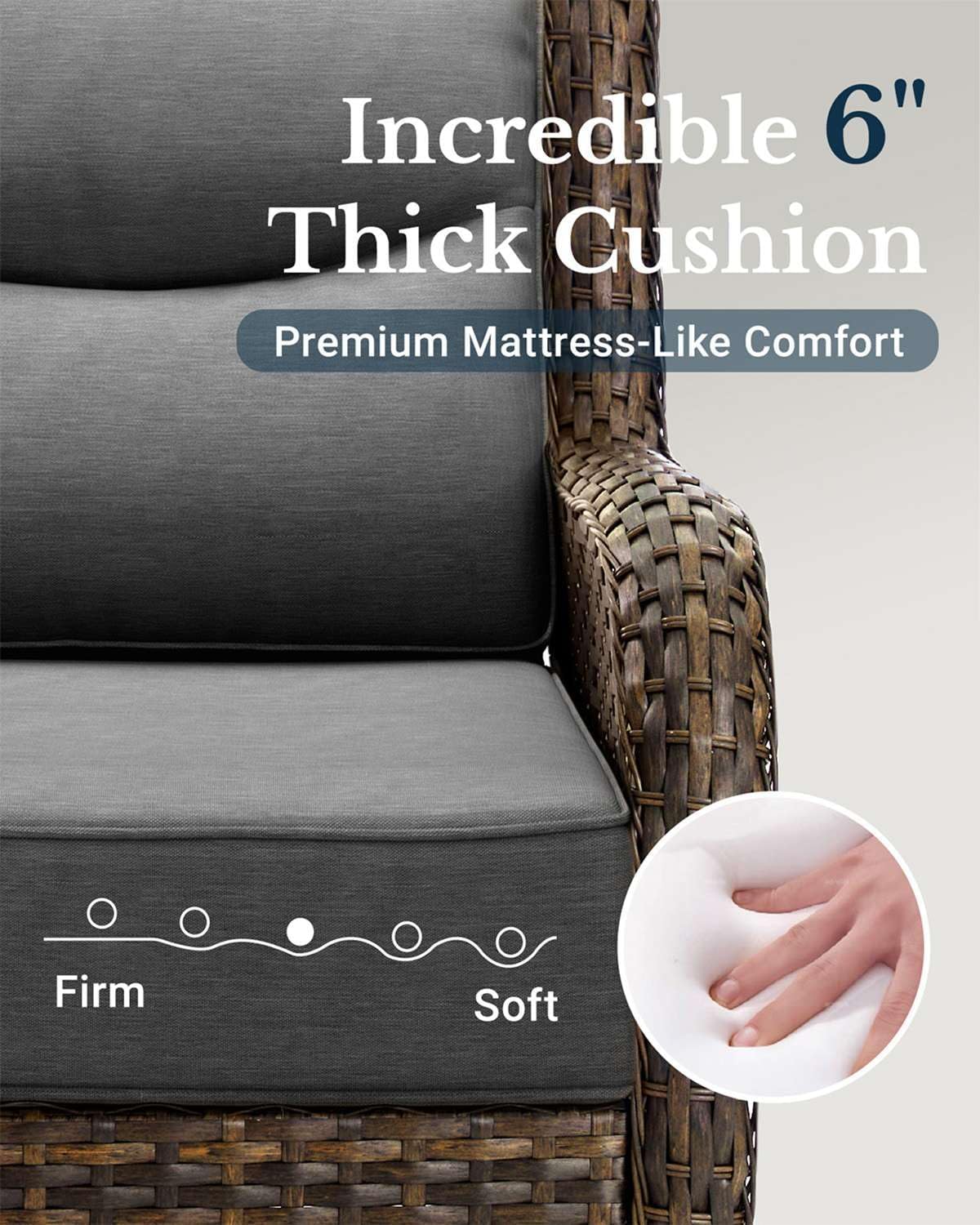 - 6-Inch Extra Thick Cushion: Each cushion of our patio swivel chair and sofa is made of 6-inch thick, 28D high-density foam, so you get 40% more comfort, 30% better bounce, and 2x the durability of standard 4-inch cushions. No sagging, just support