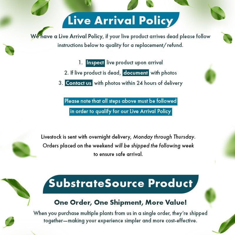 - SubstrateSource inspects each plant prior to shipping and ships all plants in healthy, stable condition with proper packing materials to ensure its safe arrival during shipping. Each plant is backed with a 100% dead-on-arrival replacement guarantee. To qualify, customers must provide a photo of the DOA plant within 24 hours of delivery.
