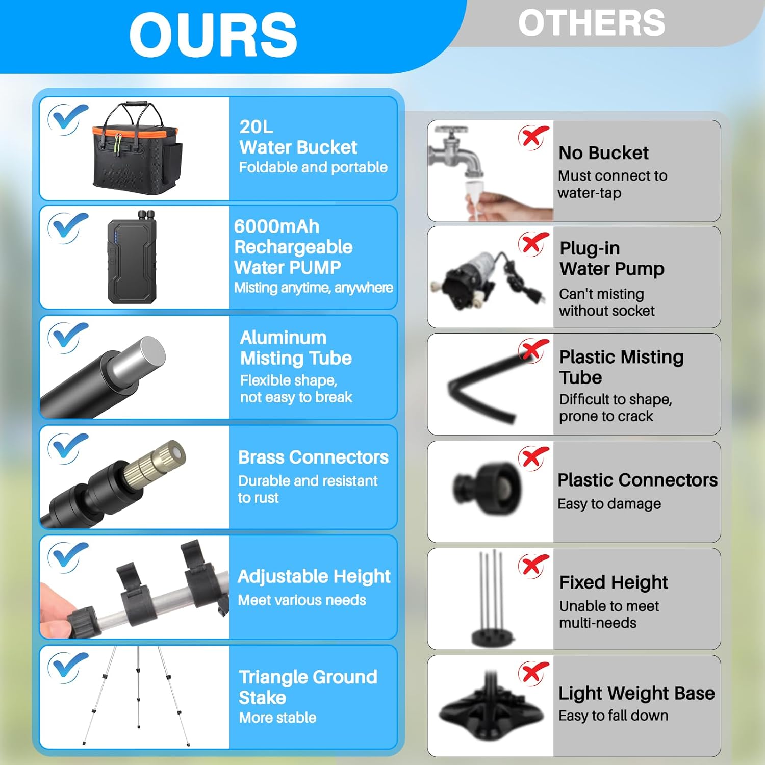 - 🌊【5.3Gal (20L) Foldable Water Bucket】For your convenience in outdoor use, the portable misters come with a 5.3Gal (20L) foldable bucket. When not in use, the bucket can be used as a storage box to store accessories or folded to save your space; when in use, it can be used as a water tank, so you are not restricted by the distance from the faucet.