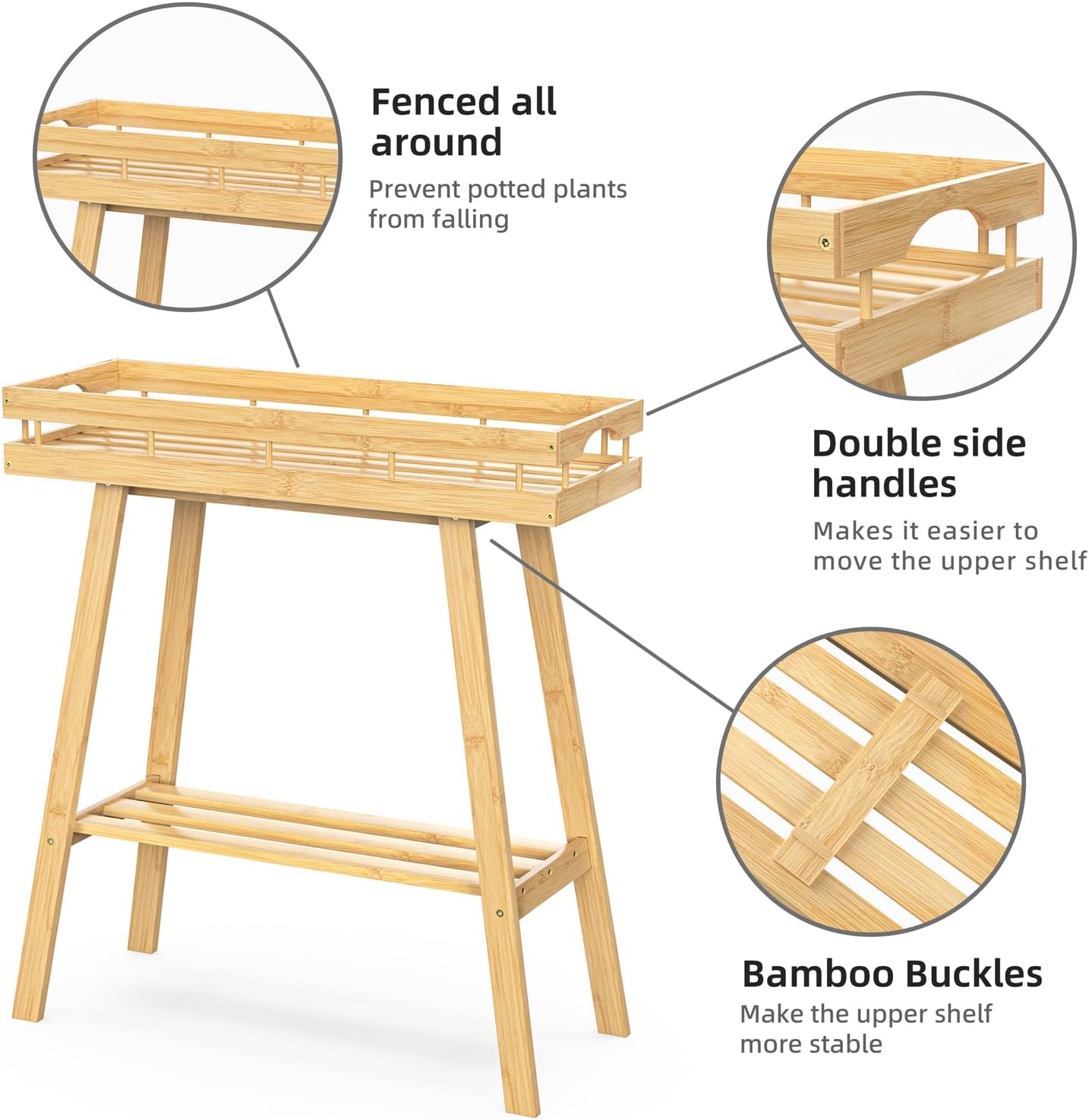 - Sturdy Construction: Crafted from bamboo, this two-tier plant stand features a polished, durable surface. Its simple yet stylish design makes it ideal for elevating spaces like the living room, balcony, garden, or patio