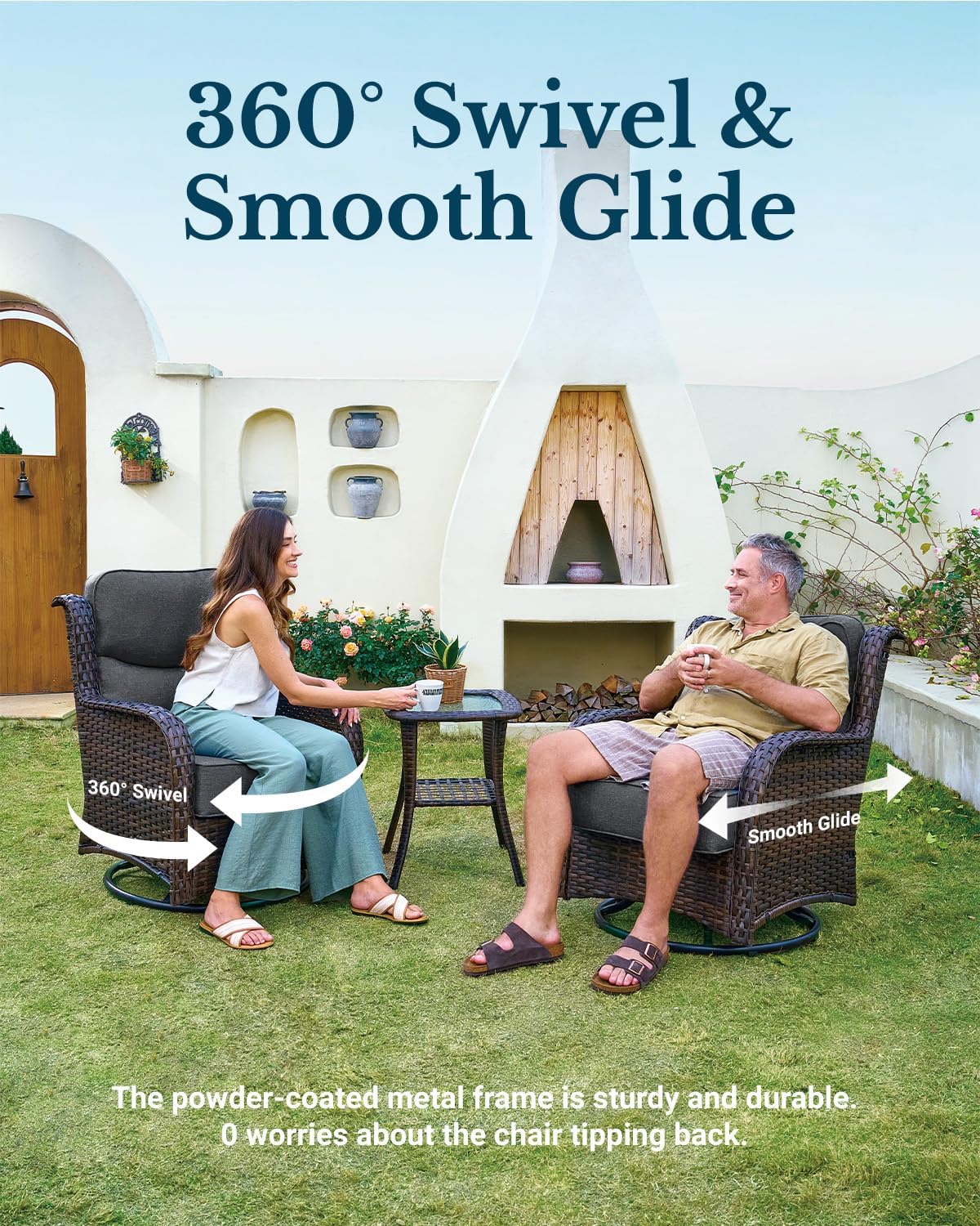 - Smooth 360° Swivel & Gentle Glide: Turn effortlessly to enjoy every view, then relax into a soothing back-and-forth motion—perfect for reading, napping, or sunset chats with friends