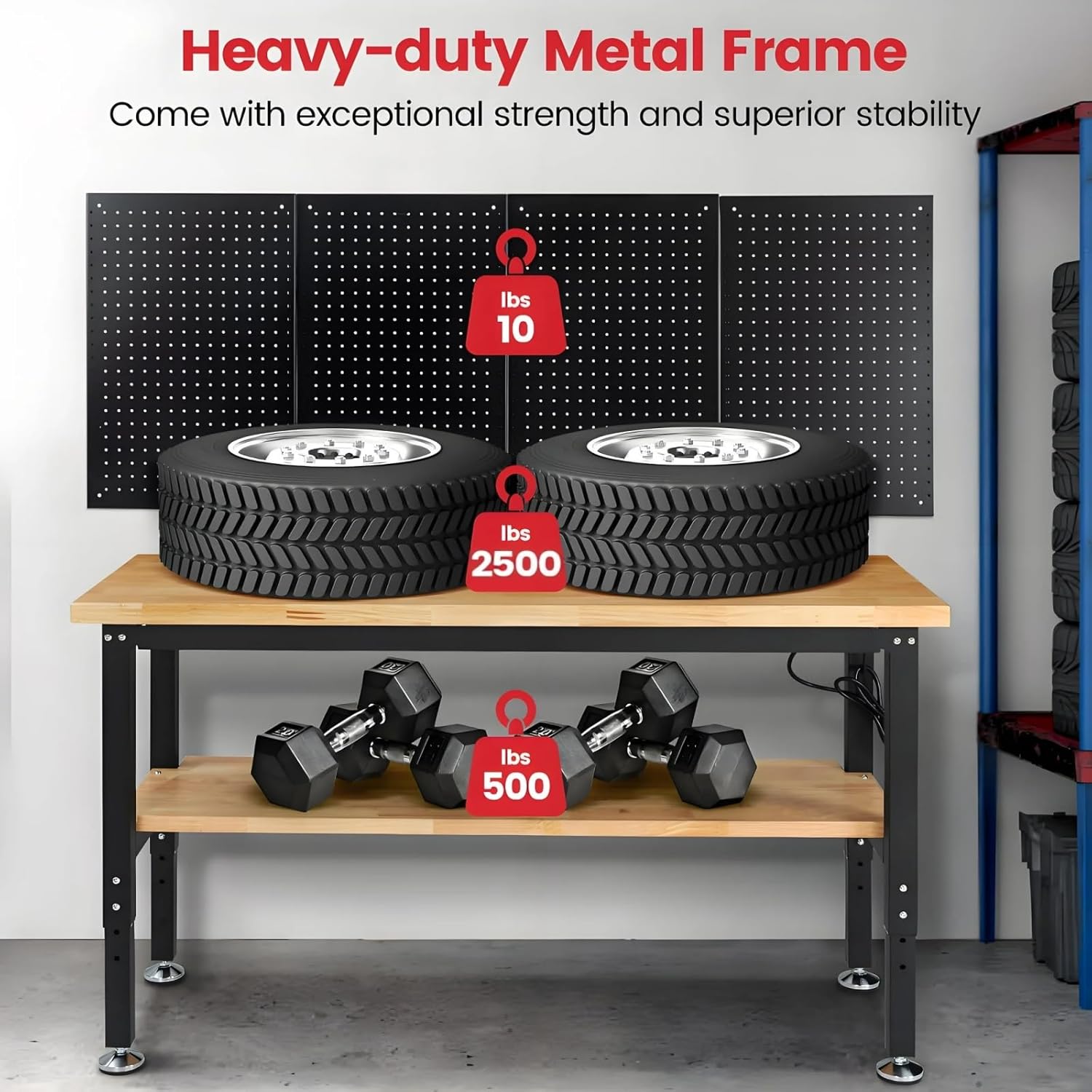 - Features a 500 lb capacity under-table shelf and four 16'' x 24'' pegboards, ideal for keeping tools organized and within reach. Includes a 3mm 60x22 inch rubber pad to protect the desktop.