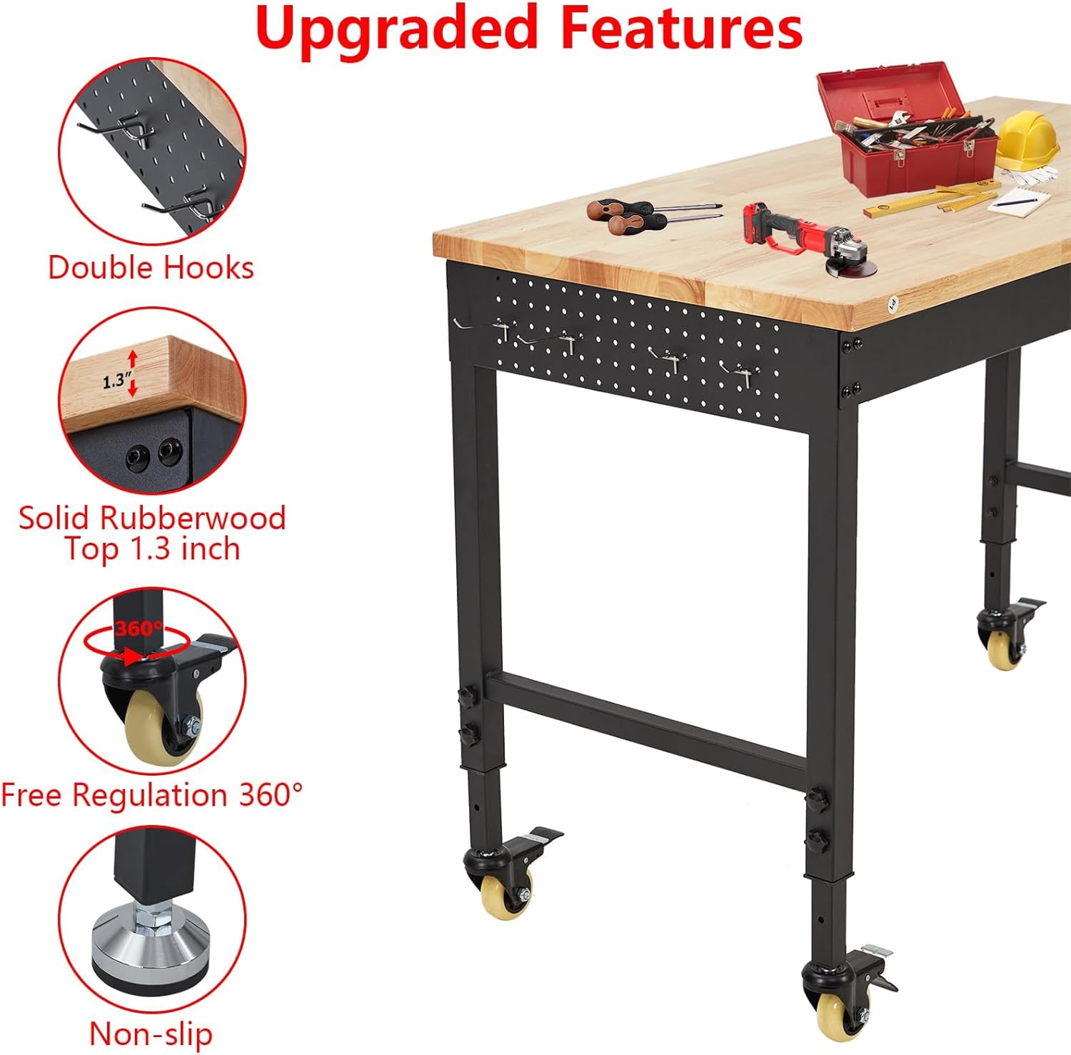 48'' Adjustable Workbench, Heavy Duty Workbench with Power Outlet and Lockable Wheels, 2000 LBS Capacity, Work Table Suitable for Office, Garage, Workshop