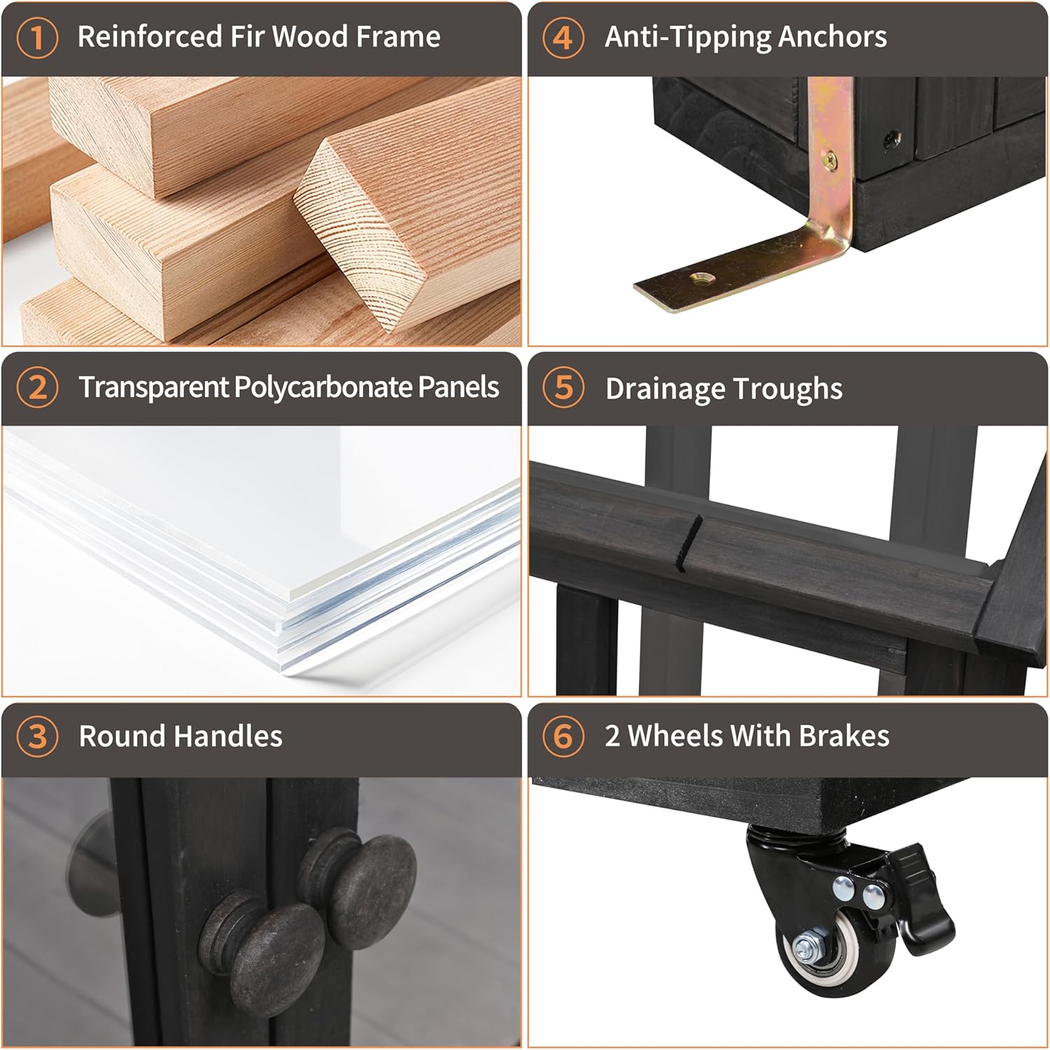 - Durable Fir Wood & Polycarbonate Panels β Built with 100% natural fir wood and UV-resistant polycarbonate panels that diffuse sunlight evenly, protecting plants from harsh rays while maintaining optimal growth conditions for seedlings, herbs, and winter crops.