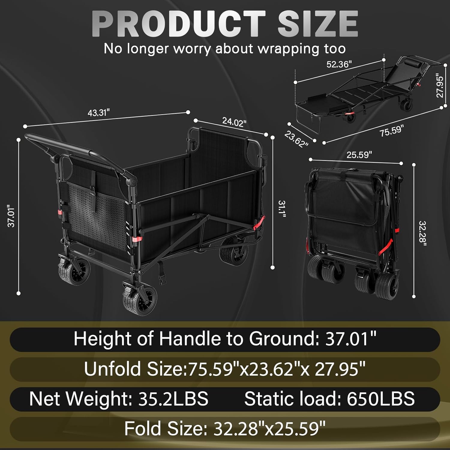 - [Massive 650LBS Weight Capacity]The wagon cart features a reinforced high strength alloy steel frame with a weight capacity of up to 650LBS, a sturdy structure that ensures long lasting durability for everyday use. The double-layered 600D Oxford fabric provides excellent waterproofing and abrasion resistance, extending the product's lifespan.