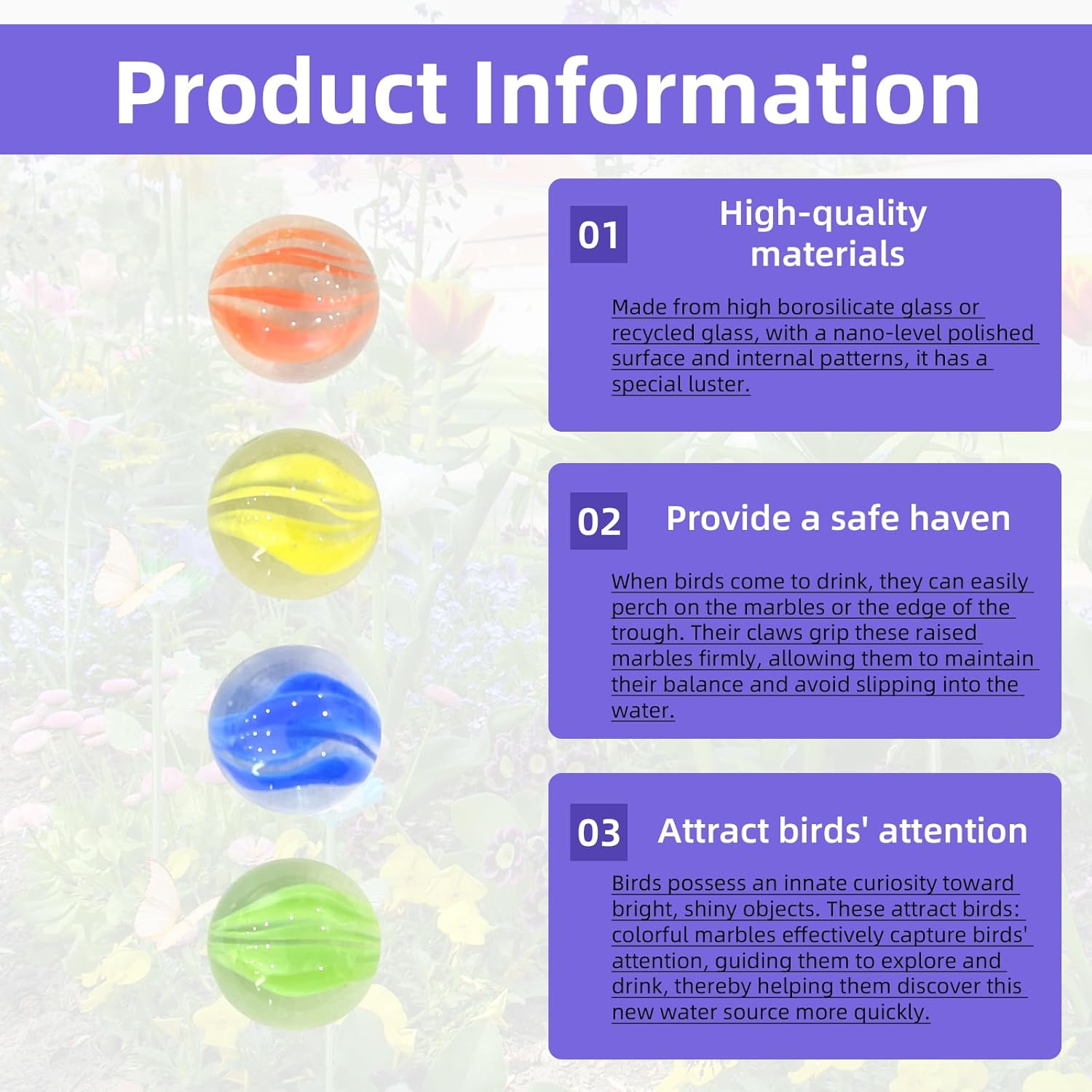 - Multi purpose function: Our product not only includes 4 bee insect drinking cups, but also 20 glass marbles. The garden bee watering station can provide water and food, such as sugar water, for bees and butterflies. It can also serve as both a bee bathtub and a butterfly bathtub. Inject shallow water into the cup and add colored beads to prevent drowning. It includes multiple marbles to ensure you can replace them at any time if necessary.