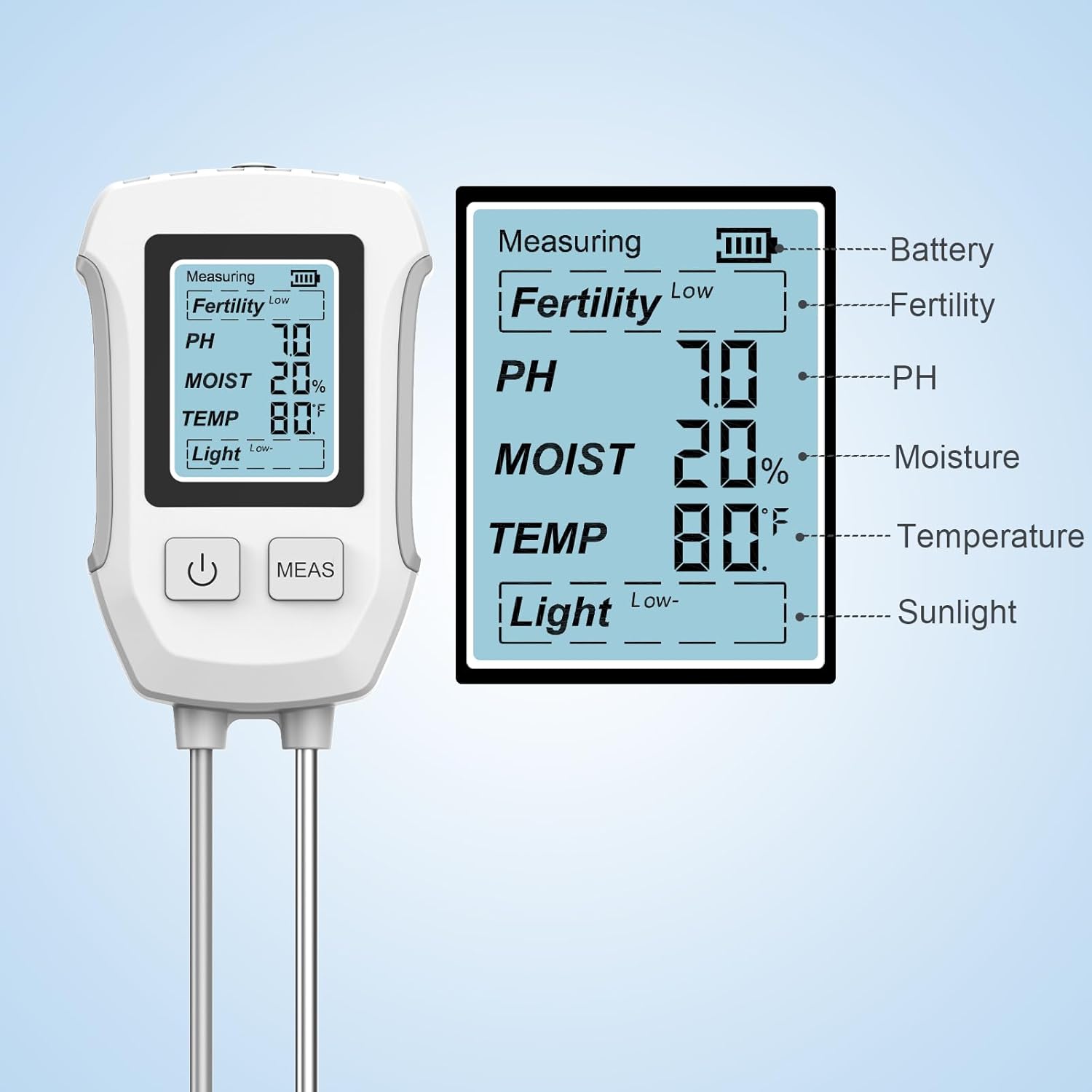 5-in-1 Soil Tester with Dual Probe, Digital Moisture Meter, pH/Temperature/Sunlight/Fertility Tester, Compact & Modern Design, for Lawn, Farming & Outdoor Plants (3*AAA Battery Required)