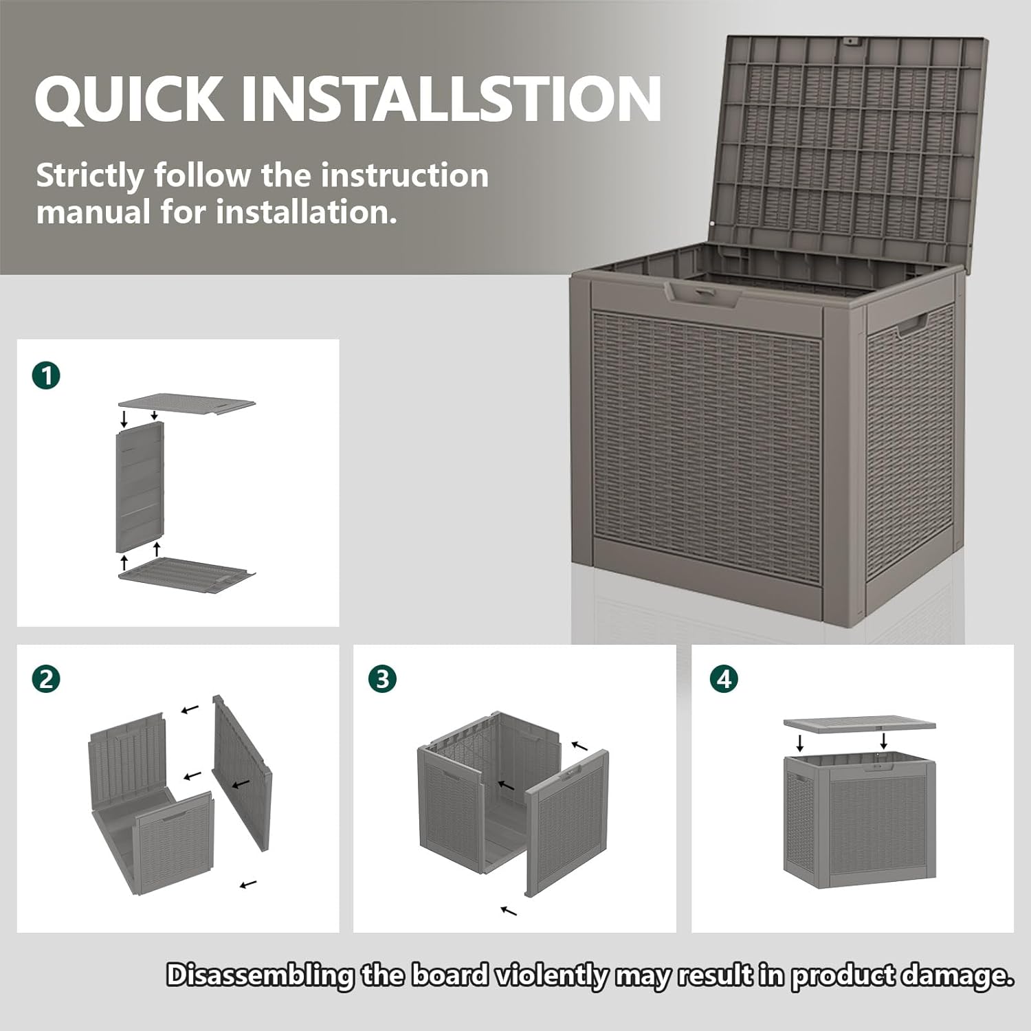 - 🔧【TOOL-FREE ASSEMBLY IN MINUTES】 No extra tools, no hassle — this outdoor storage box features a snap-fit design that lets you assemble it in about 10 minutes. Perfect for quick setup so you can enjoy more time organizing and less time working.