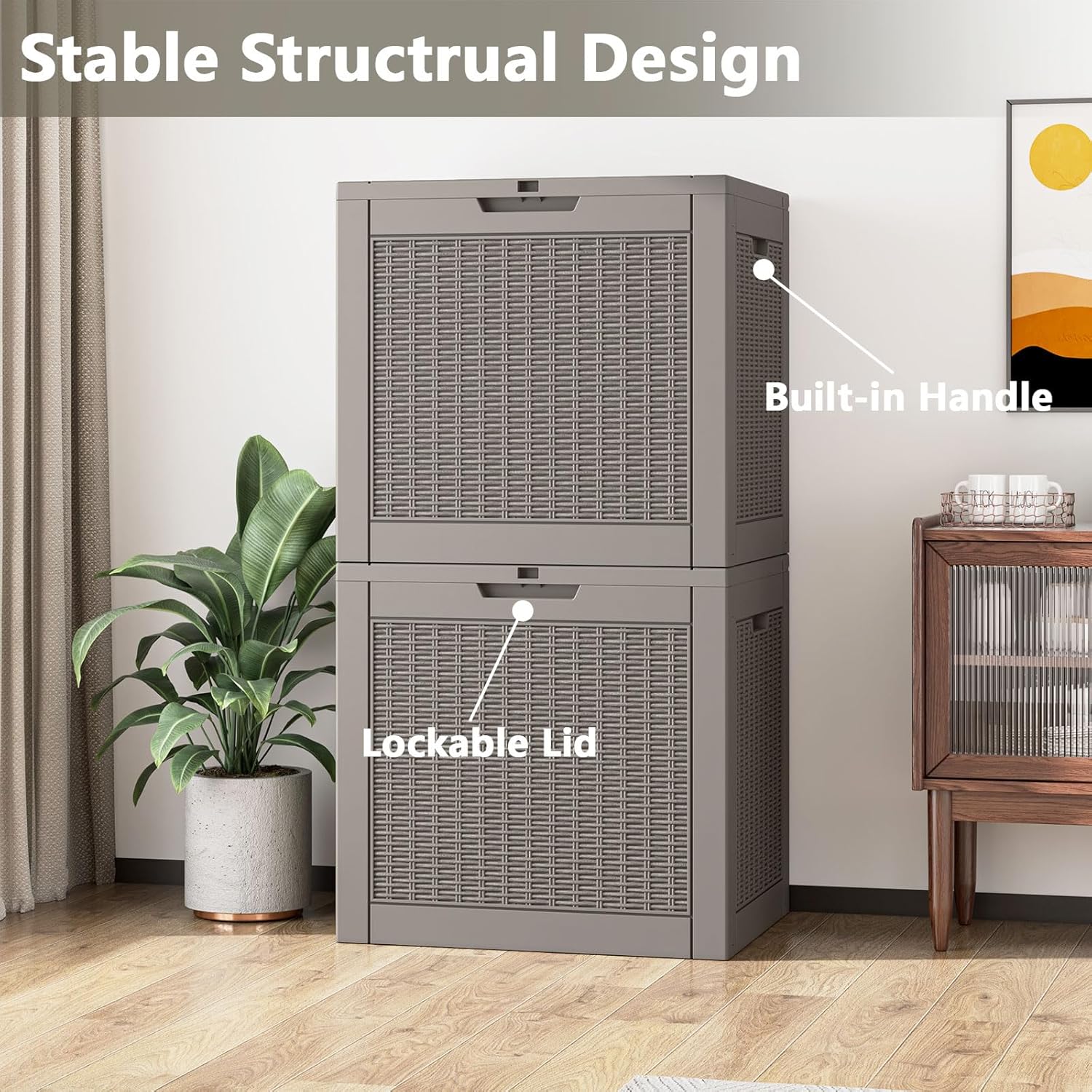 - ☀️【PREMIUM RESIN MATERIAL】 Made of high-density polypropylene resin, this storage bin is waterproof, UV-resistant, and dustproof. The rattan-inspired texture not only adds elegance to your space but also blends seamlessly with patio or garden décor.