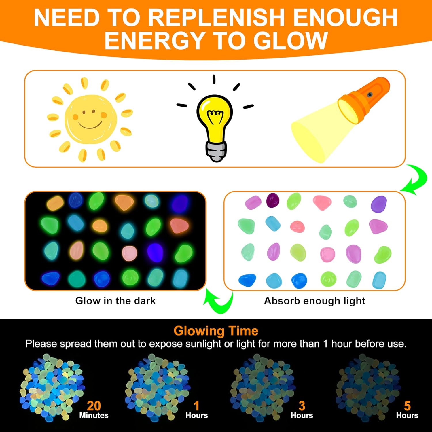 - Reusable Glow: To maximize the glowing effect of these glow rocks, simply expose them to sunlight or artificial light for over an hour before nightfall. By spreading them evenly in your outdoor garden, you enhance their ability to absorb light. Luminous stone can repeatedly emit light. If it's not bright enough, please expose it to sunlight or light again