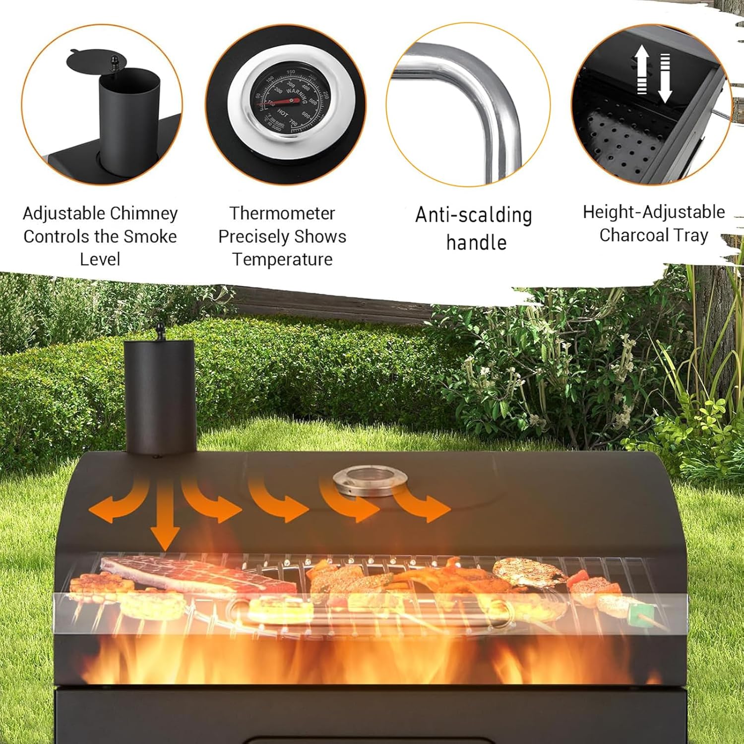 - Height-Adjustable Charcoal Tray:Charcoal grills features lifting handle on both right side, you can roll the handle to raise or lower the charcoal tray. So it's an immediate increase of the implied temp without messing with the grill or fuel.