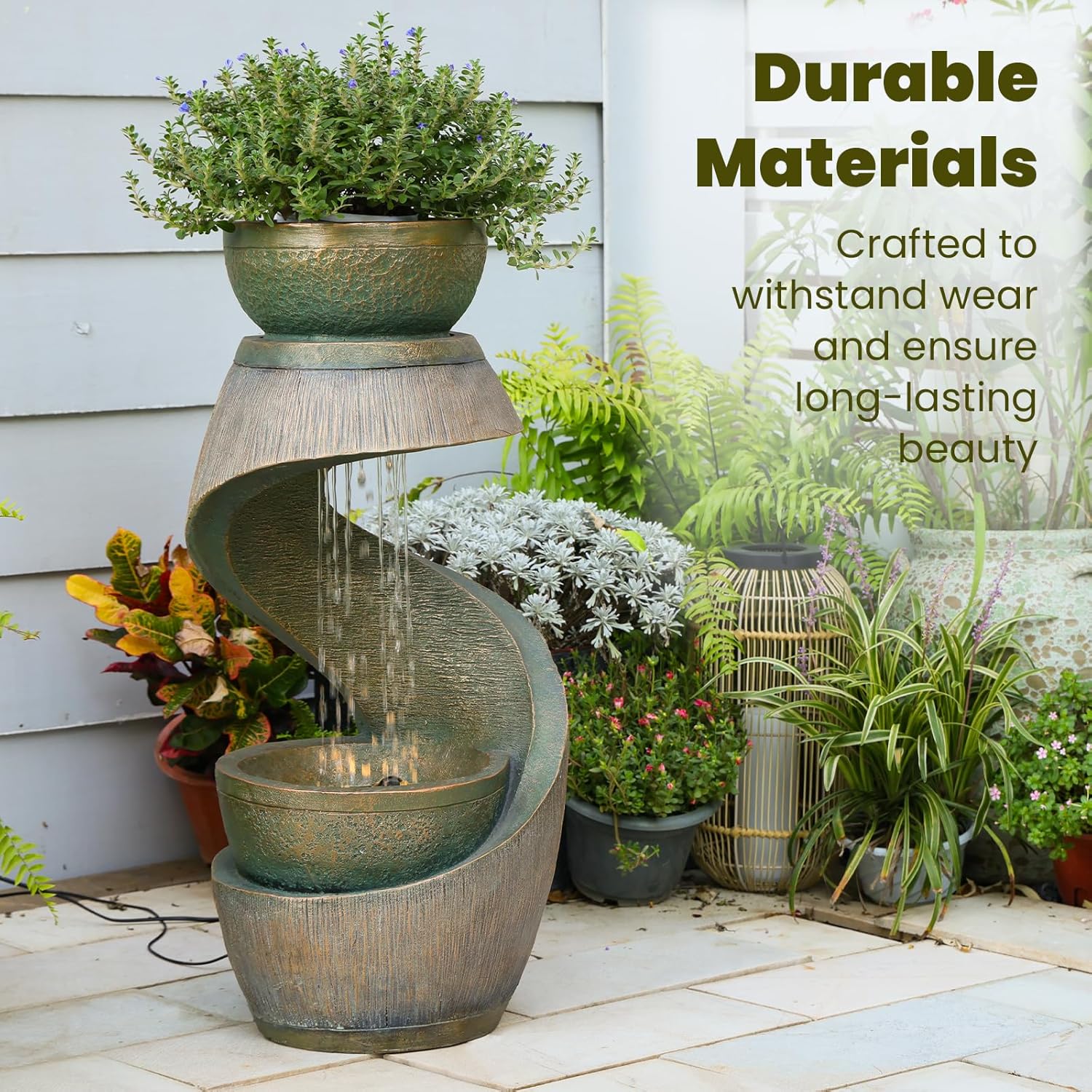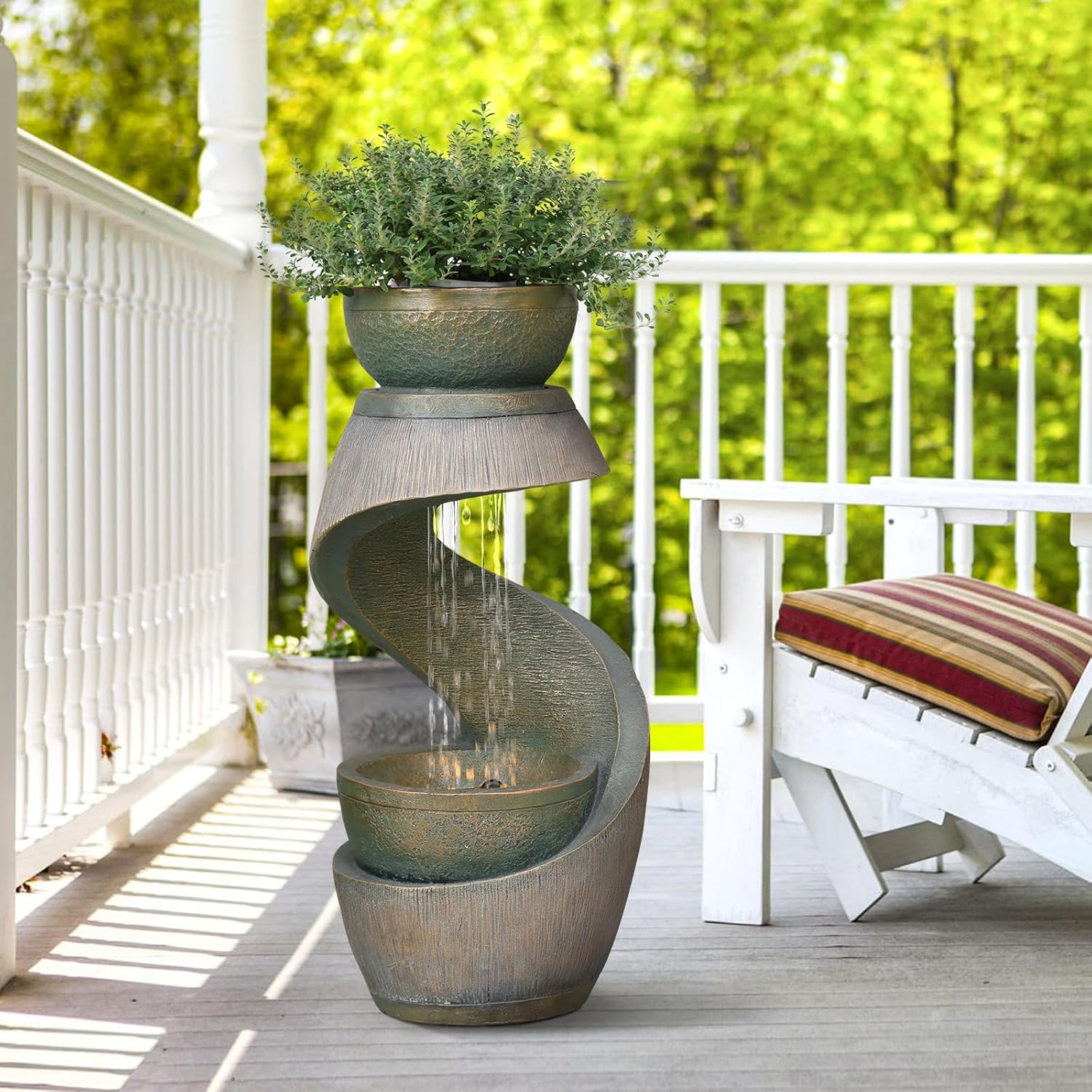 31.9" S-Shaped Water Outdoor Fountain–Modern Cascading Waterfall Feature with LED Lights & Planter Bowl, Garden Fountains Outdoor for Patio, Balcony, Yard or Home Decor, Resin Waterfall, Gold
