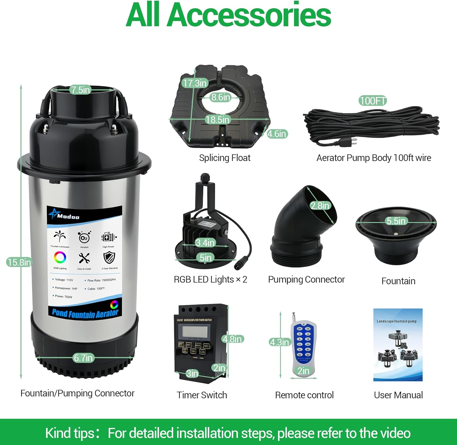 - [Easy Installation]: The RGB Light Fountain Aerator is easy to install and maintain. It oxygenates your water feature while revitalizing the water and keeping your fish healthier. Installation is simple: simply connect the LED light cord to the pump, tie the cord to the float, and anchor the cord to shore with an anchor. For convenient use, simply plug it into a 110V outlet or connect it to a timer for on/off operation, saving time and effort. Note: This package anchor cord is not included.