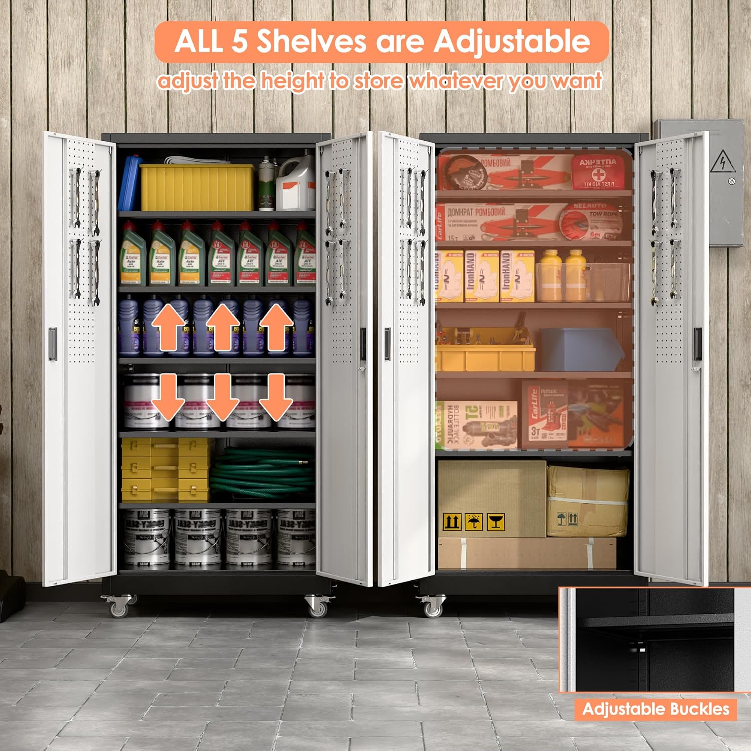 - Metal Storage Cabinet : 71"H metal storage cabinet has 5 adjustable and removable shelves that can be adjusted while ensuring maximum adaptability and convenience to meet your own unique storage and organization needs. Metal storage cabinet have 2 round pegboards and 4 hooks, and if you need more you can easily buy more suitable hooks