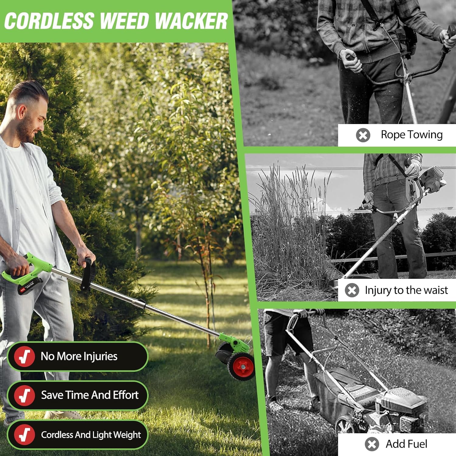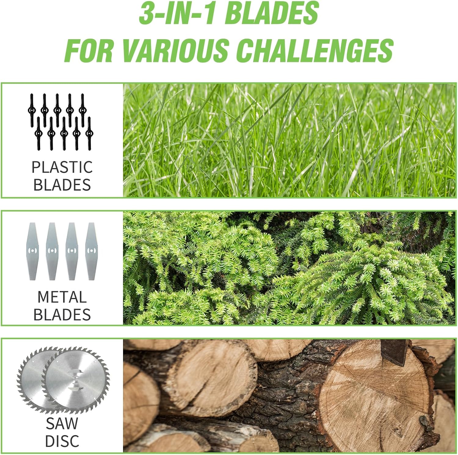 - 3 Blades for All Lawn Types + Dual Wheel Support: Includes 3 blade types (alloy/plastic) for dense grass, sparse turf, or tough weeds. The dual front wheels provide stability and smooth maneuvering, reducing fatigue during long trimming sessions