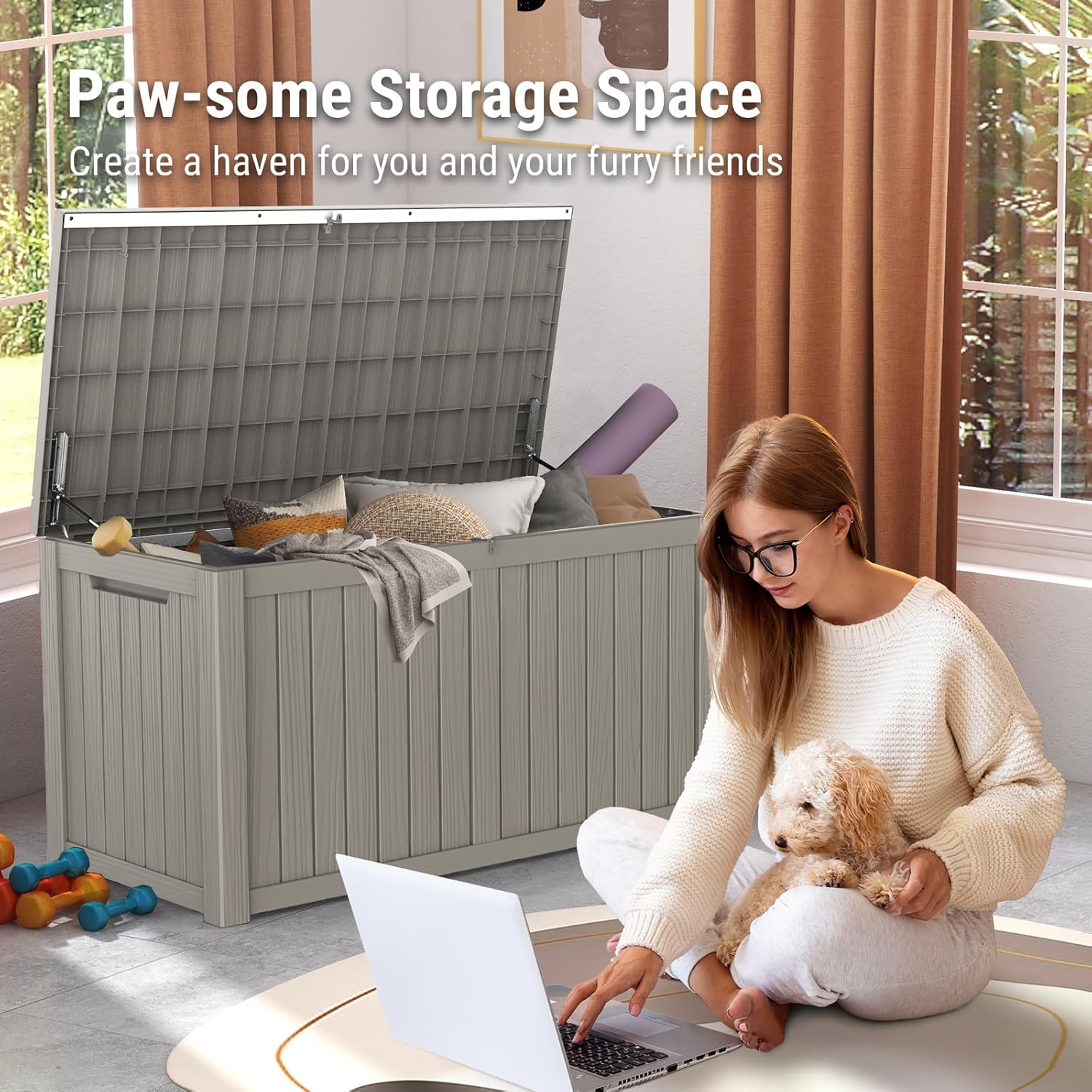 - 【Weatherproof & UV-Resistant】- Crafted from upgraded PP resin with an refined woodgrain texture, this deck box withstands all weather conditions, the panels and lid have passed rigorous 1,000-hour 0.67w/m² UV exposure aging tests, ensuring long-lasting durability, keep your belongings dry, clean, and protected year-round with minimal maintenance